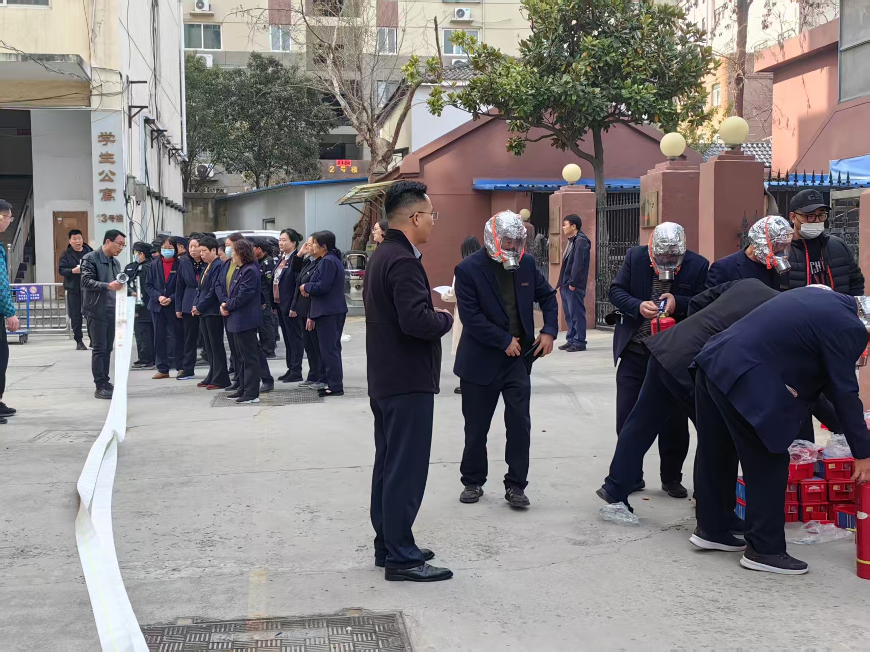 在随后的消防技能大比武环节,宿管人员围绕“防烟面罩快速佩戴”“灭火器精准灭火”“消防水带规范连接”三个实战项目展开比拼。通过比武,不仅检验了前期培训成果,更激发了全体参训人员钻研技能、提升能力的积极性。