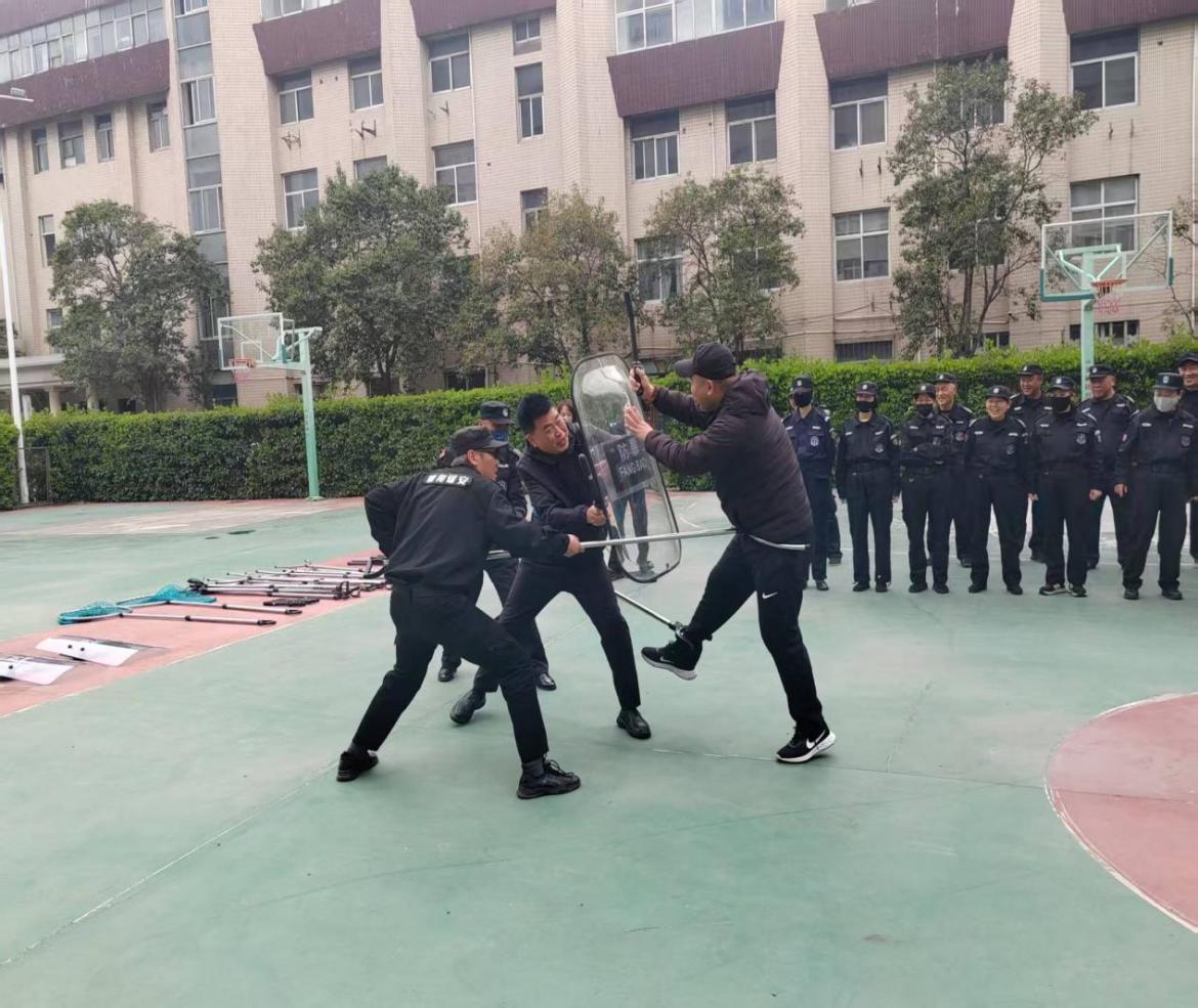 演练现场,警官向安保人员强调了防范恐怖暴力袭击的重要意义,细致讲解防暴盾牌、防护长棍、防暴钢叉、锁脚器等常用反恐防暴器材的操作规范与使用技巧以及各种暴恐场景下安防战术的应用方法。在分组比拼演练中,针对器材实操发力要点、队员站位配合、应急联动衔接等关键环节进行示范指导,确保每名参训人员吃透动作要领、熟练掌握实操技能。
