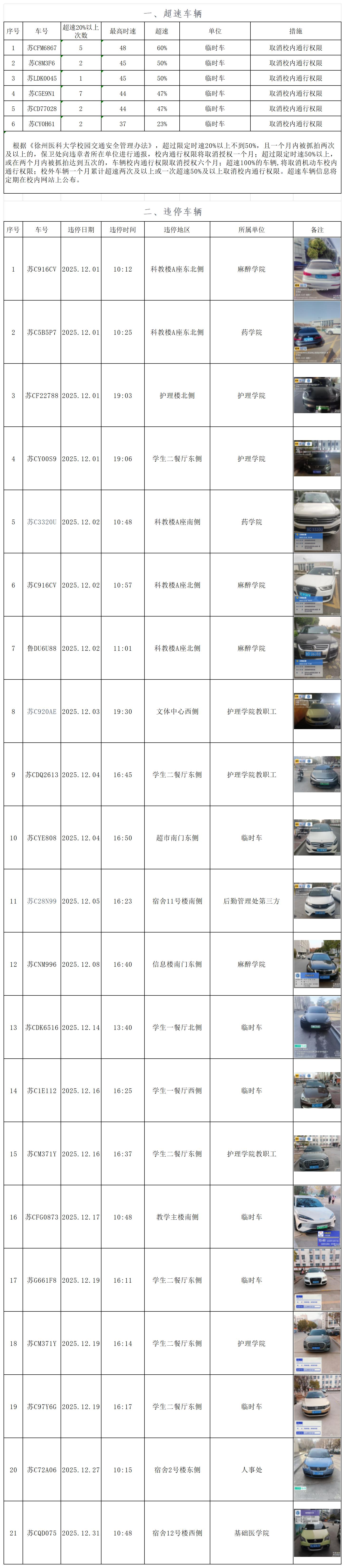 根据《徐州医科大学电动车管理办法》(徐医大保字〔2025〕2号)《徐州医科大学校园交通安全管理办法》(徐医大保字〔2025〕1号),电动自行车停放区域应与自行车保持一致,按先后次序就近停放整齐,不得妨碍其他车辆和行人通行。乱停、乱放的电动车,保卫处有权对其进行锁车处理。机动车校内主干道时速不得超过30公里,学生生活区及教学区时速不得超过20公里;所有机动车在校园内应按照停车指示标志停放。现将主校区违章车辆通报如下。