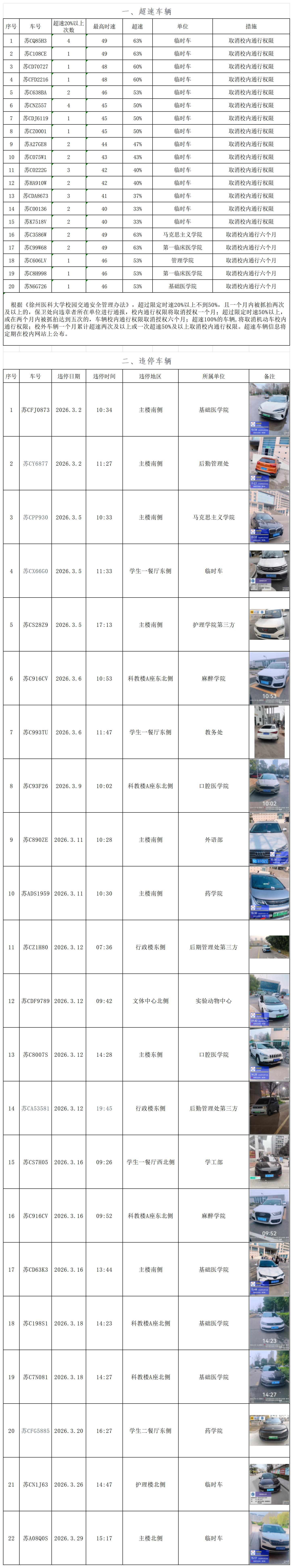 根据《徐州医科大学电动车管理办法》(徐医大保字〔2025〕2号)《徐州医科大学校园交通安全管理办法》(徐医大保字〔2025〕1号),电动自行车停放区域应与自行车保持一致,按先后次序就近停放整齐,不得妨碍其他车辆和行人通行。乱停、乱放的电动车,保卫处有权对其进行锁车处理。机动车校内主干道时速不得超过30公里,学生生活区及教学区时速不得超过20公里;所有机动车在校园内应按照停车指示标志停放。现将主校区违章车辆通报如下。